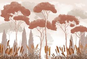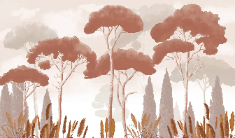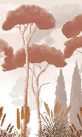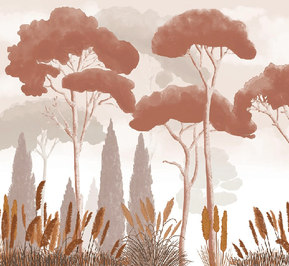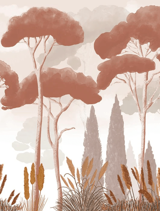 Cypress, pine, and pampas grass wallpaper in terracotta