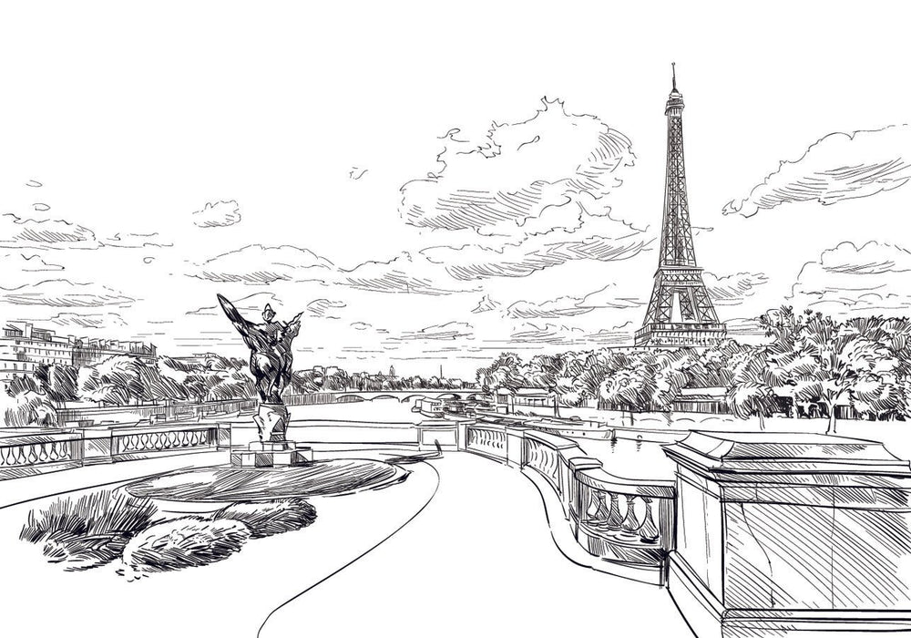 Immerse yourself in the timeless elegance of Paris with our exquisite wallpaper, capturing the magic of the City of Lights. Inspired by artistic black-and-white prints, every detail is meticulously hand-drawn, offering an authentic and refined aesthetic. This wallpaper evokes the very essence of Paris, with the majestic Bir Hakeim Bridge and the iconic silhouette of the Eiffel Tower standing proud in an enchanting urban panorama.
