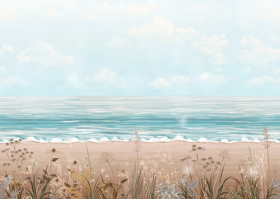 Discover our magnificent panoramic sea view wallpaper, created with passion in watercolor. This artistic masterpiece captures the infinite beauty of the ocean, sand and clouds, transporting your home to distant horizons. With delicate touches of wildflowers adding a touch of natural charm, this panoramic wallpaper inspires escape and invites you on an immersive journey.
