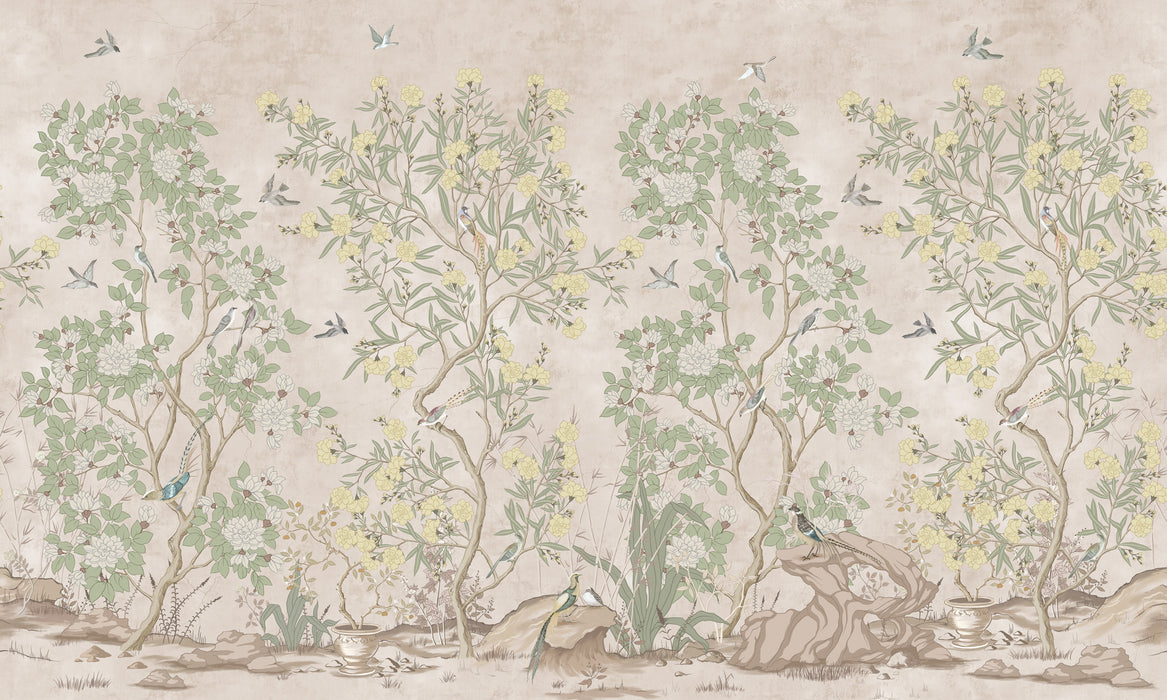 This chinoiserie wallpaper depicts a plant and floral decor, with soft, pastel colors. Birds accompany the painting to add softness and originality.