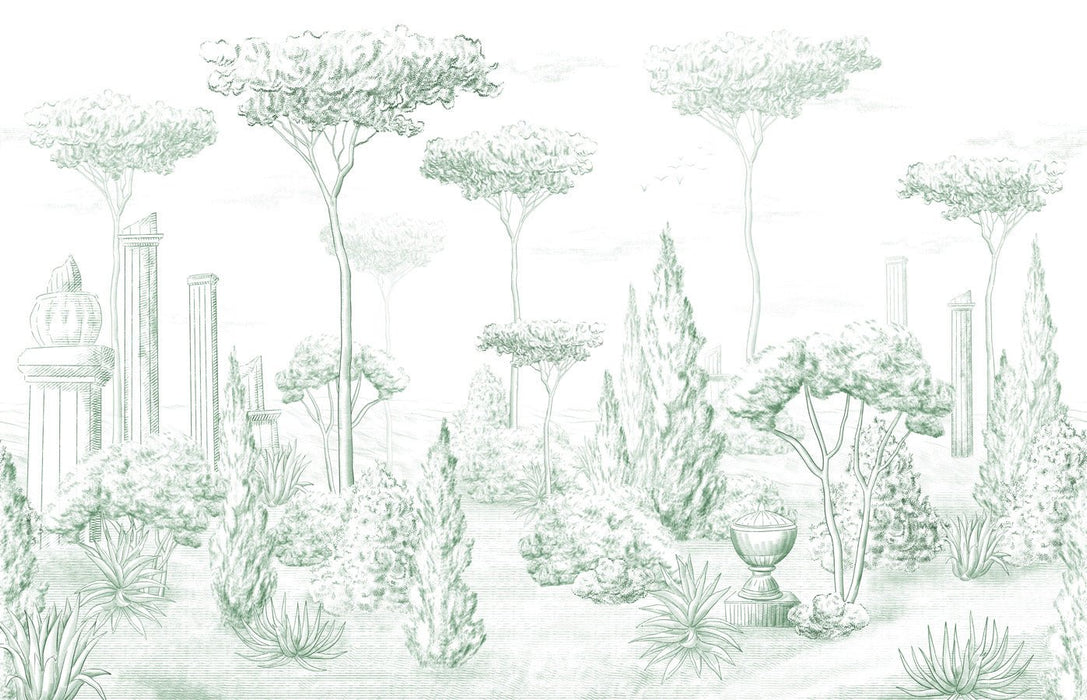 Our pencil-drawn panoramic Roman pinewood style wallpaper is a true masterpiece that will add a touch of sophistication and charm to your interior. The finesse of the pencil strokes gives an impression of delicacy and precision, while the depiction of pine trees evokes the classic beauty of Roman gardens.