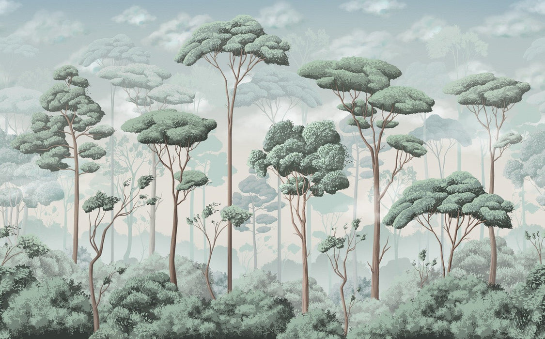 Immerse yourself in the delicate, refined world of a pine forest with our voluptuous pinewood panoramic wallpaper. This made-to-measure wall tapestry will enhance your interior. An elegant, artistic note for this painting-like wallpaper. This wall decor features a bouquet of tall trees in a range of blues and greens. This panoramic wallpaper is ideal for any room in the house. It's also ideal for professional settings such as hotel lobbies, guest rooms and restaurants. Buy now your made-to-measure, French and eco-responsible panoramic wallpaper.