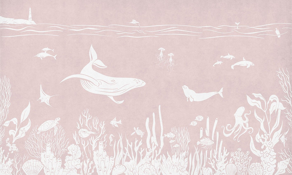 Your baby's or child's bedroom is transformed by our pink aquatic stroll wallpaper. This pastel monochrome pink wallpaper softens and soothes the atmosphere in your child's room. Ideal for supporting your child's development and awakening, this children's sea animal wallpaper tells tender stories. Let's plunge together between dolphins, whales, fish and corals to marvel and learn while having fun. The pink of this wallpaper is soft.