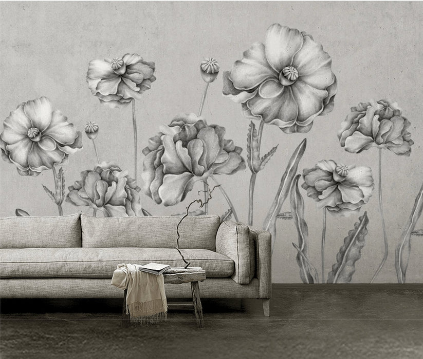 Black and white bucolic flowers wallpaper