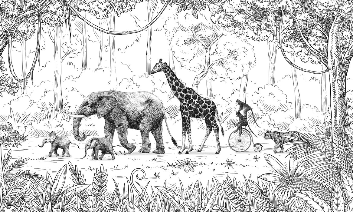 The black and white monochrome children's jungle wallpaper is the ideal wallpaper to decorate your child's bedroom with taste and personalization. This wallpaper is also available in sepia for a warmer look. This panoramic children's jungle wallpaper is made to measure, for a stunning and sublime result. A children's jungle mural depicting the animals of the savannah, to tell your child beautiful stories.