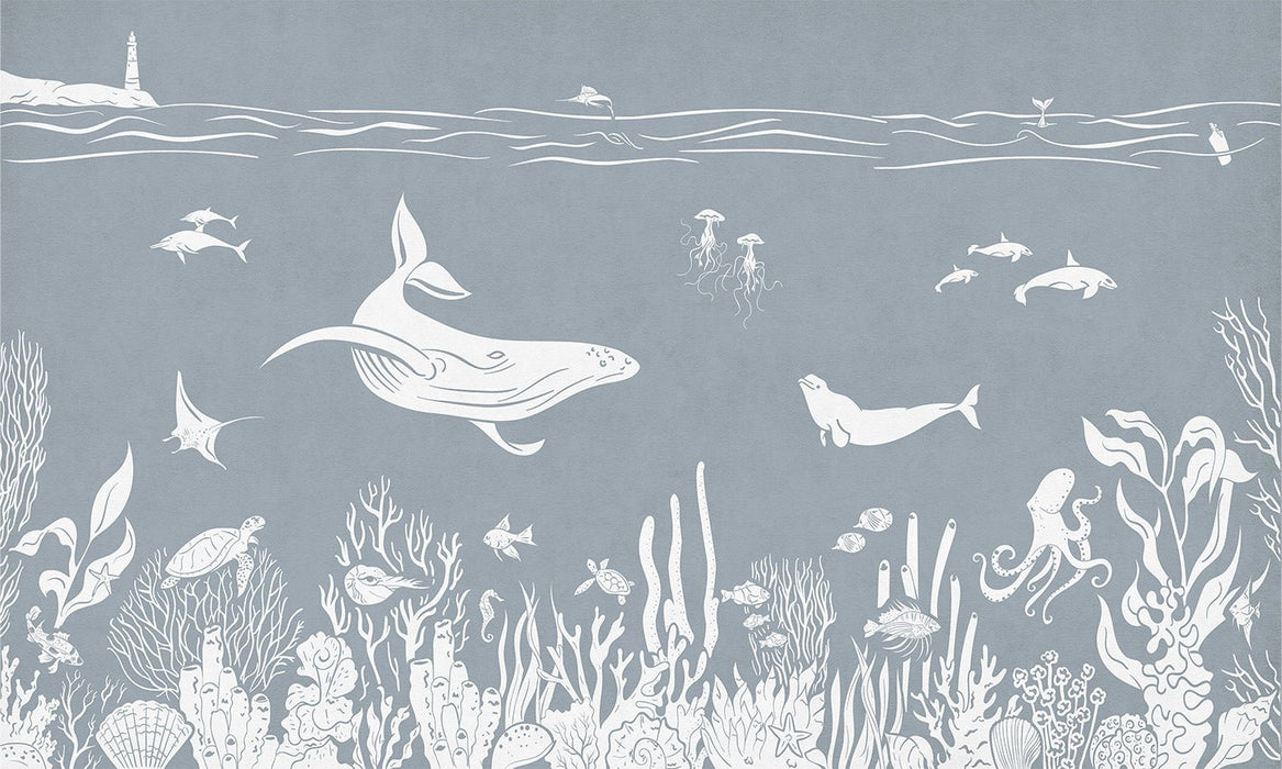 Your baby's or child's bedroom is transformed by our blue aquatic stroll wallpaper. This pastel blue monochrome wallpaper softens and soothes the atmosphere in your child's room. Ideal for supporting your child's development and awakening, this children's sea animal wallpaper tells tender stories. Let's plunge together between dolphins, whales, fish and corals to marvel and learn while having fun. The blue of this wallpaper is soft.