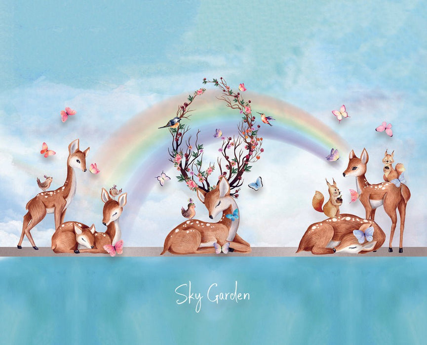 Bring softness and tenderness into your child's bedroom with this soft rainbow deer wallpaper, featuring soft colors and deer motifs. The tender watercolor motifs will soothe your child. Easily create the imaginary world he's always dreamed of with our custom-made XXL tapestry. Made-to-measure wall tapestry for children that respects the environment and interiors (water-based ink printing, PVC-free).