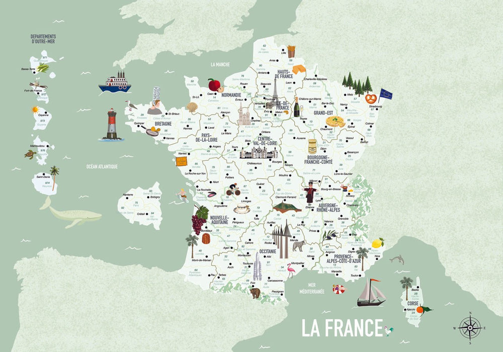 Discover our green children's map of France wallpaper. This map of France is an easy way for young and old to learn about the geography of France. This illustrated world map wallpaper lets you learn about the specialities of regions or departments. A fun, easy-to-learn and beautifully illustrated wallpaper that highlights all the riches of France: monuments, food, mountains, rivers, departments... How can you resist this carte de France wall mural? This panoramic mural is in a soft, Scandinavian style, available in three colors. It's ideal for creating a relaxing, sleep-inducing atmosphere, but also for facilitating learning and inspiring the whole family to discover the four corners of France. It's easy to create a unique decor with this made-to-measure wallpaper! We're sure you'll love it. All our wallpapers are Eco-friendly, Kids Friendly. They're environmentally friendly and kind to interiors. Place this panoramic carte de France wallpaper in your child's bedroom, playroom or classroom! Children will be amazed.