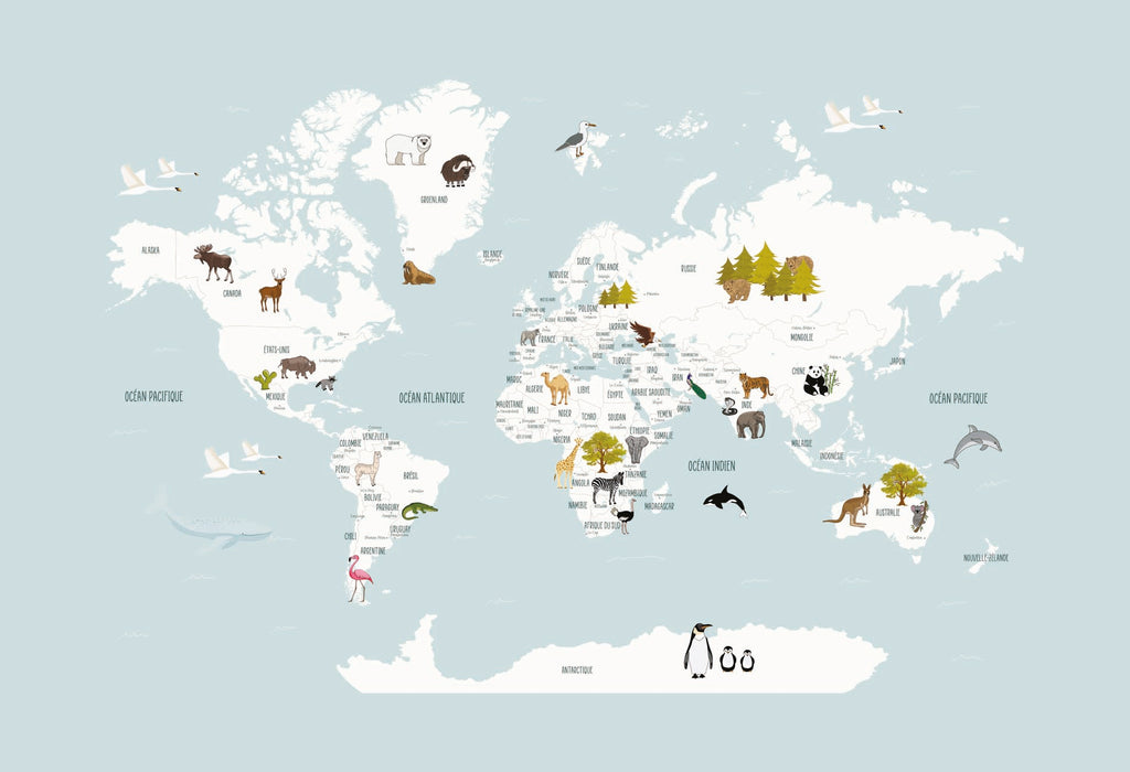 Offer a unique and educational decorating experience with our glacier blue children's French world map wallpaper, exclusive to MuralConcept. Playful and aesthetically pleasing, this panoramic world map illustrates children's favorite countries, capitals and animals, in a soft, Scandinavian style. Ideal for creating a relaxing, sleep-inducing atmosphere, this made-to-measure wallpaper is perfect for a child's bedroom. Available in a range of trendy colors (beige, gray, ice blue, pastel green, old rose), it's both eco-responsible and safe for children(Eco-friendly, Kids Friendly). Transform your child's space with a wall tapestry that combines education and decoration. Order now and customize it to your own taste!