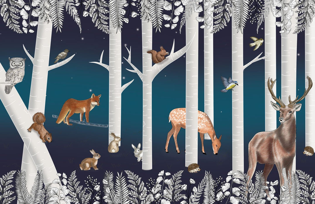 With our enchanted wood wallpaper and its night-time version of animals, it's as if you're entering a forest glade. A multitude of endearing animals are drawn on this panoramic wallpaper, including squirrels, deer, rabbits and hedgehogs. So many companions to accompany your child through the night. The natural colors of this wall creation make it easy to match the room's decor.