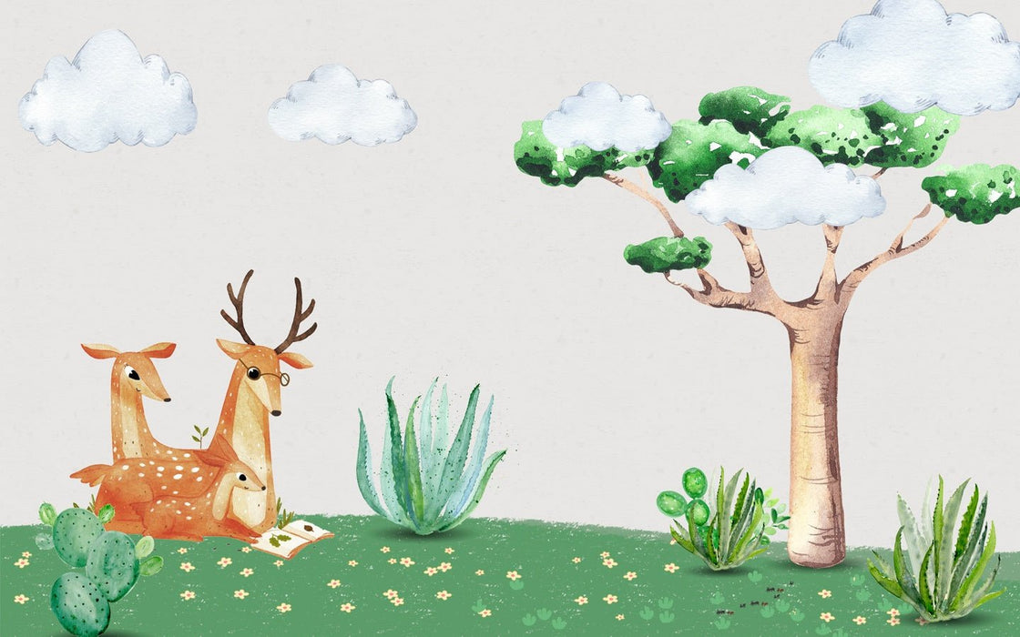 Discover our plant & deer wallpaper. This animal tapestry for children is soothing and ideal for a nursery, baby's room or playroom. A bespoke children's wallpaper that will bring softness and tenderness to your room. A soothing, warm children's mural that will transform your interior. This vegetal wallpaper has been specially designed for your child's living space. This panoramic wallpaper is healthy and environmentally friendly.