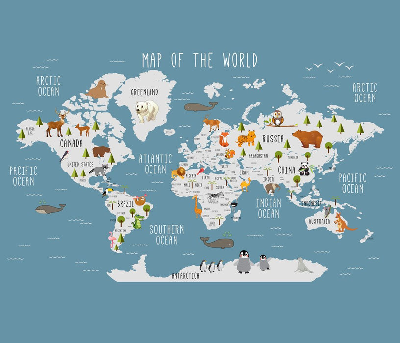 This dark blue Animals illustrated world map wallpaper is perfect for playfully decorating a child's bedroom. The pastel colors and animals of the world will give a soft style, and an atmosphere conducive to relaxation. A superb visual ensemble to fascinate and entertain children. Easily create a playful, childlike decor with this custom-made wallpaper! Your wall decor is printed on a waterproof wallpaper with a shiny silky fabric effect.