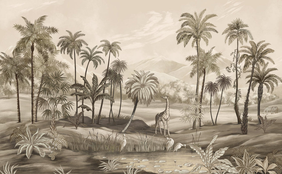 Composed like a tableau vivantthe décor features a rich, symbolic natural world: giraffes, palms, exotic birds, reeds and zebras make up a silent landscape bathed in elegant, timeless sepia light.