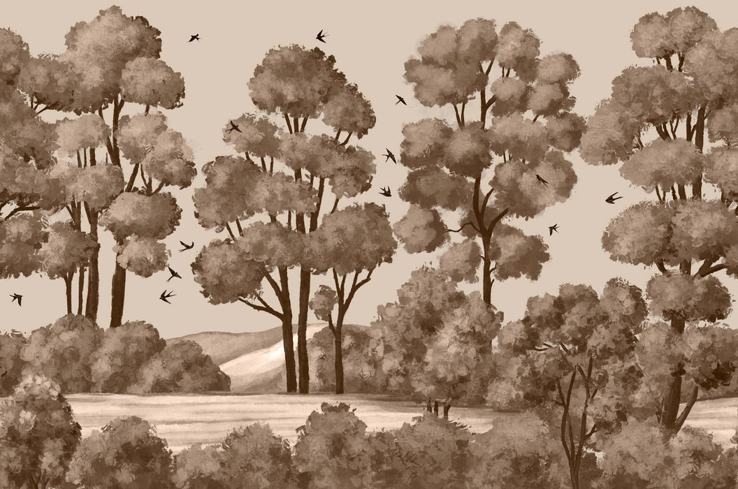 Enhance your interior with the sepia-toned forest river landscape wallpaper. This vegetal mural is ideal for adding depth to your room and transforming its dimension. The result of an artist's painting, this mural is as captivating as it is dreamy. This watercolor-style wall design depicts a pretty clearing with trees and birds. Make your walls dream with a panoramic wallpaper worthy of a masterpiece! This made-to-measure wallpaper model is available in a range of colors to suit different moods.