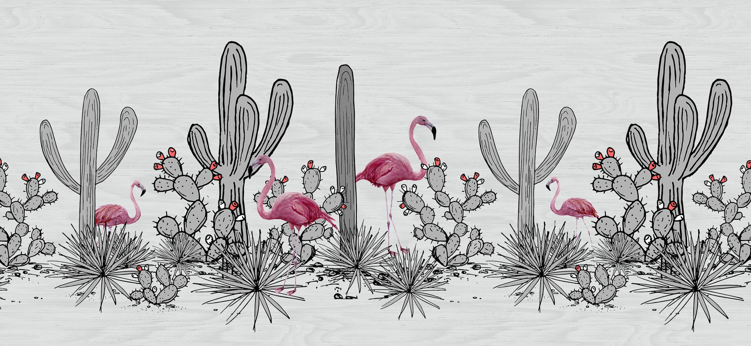 Panoramic cactus & pink flamingo wallpaper