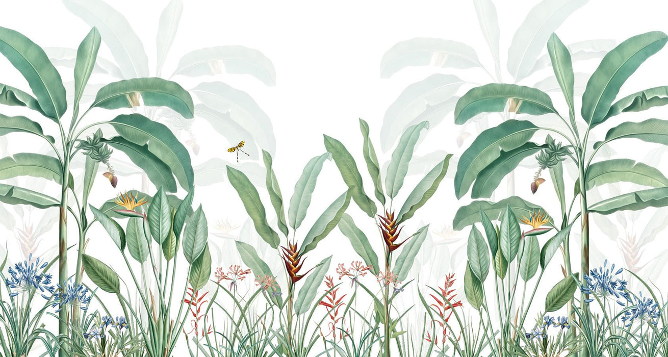 Tropicalis wallpaper features delicate butterflies and colorful flowers, adding a vibrant, colorful touch to your interior design. A touch of originality on your wall that will set you apart from other exotic wallpapers.