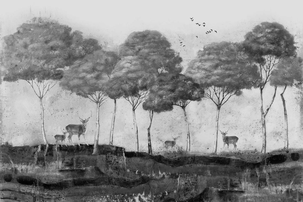 This panoramic non-woven Pines & Mystic Deer wallpaper is ideal for creating a spectacular wall decor in grisaille. Decorated in trendy black and white, this wallpaper is like a mural, a unique creation to dress up your walls. A wall fresco for an elegant, exotic style. Easily create a unique interior with our custom panoramic wallpaper.