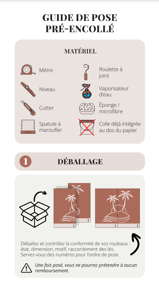 If you've ordered a custom panoramic wallpaper printed on SOFT TOUCH or VINYLE PRO non-woven backing, click on the image to download the installation guide to help you install your new wallpaper.