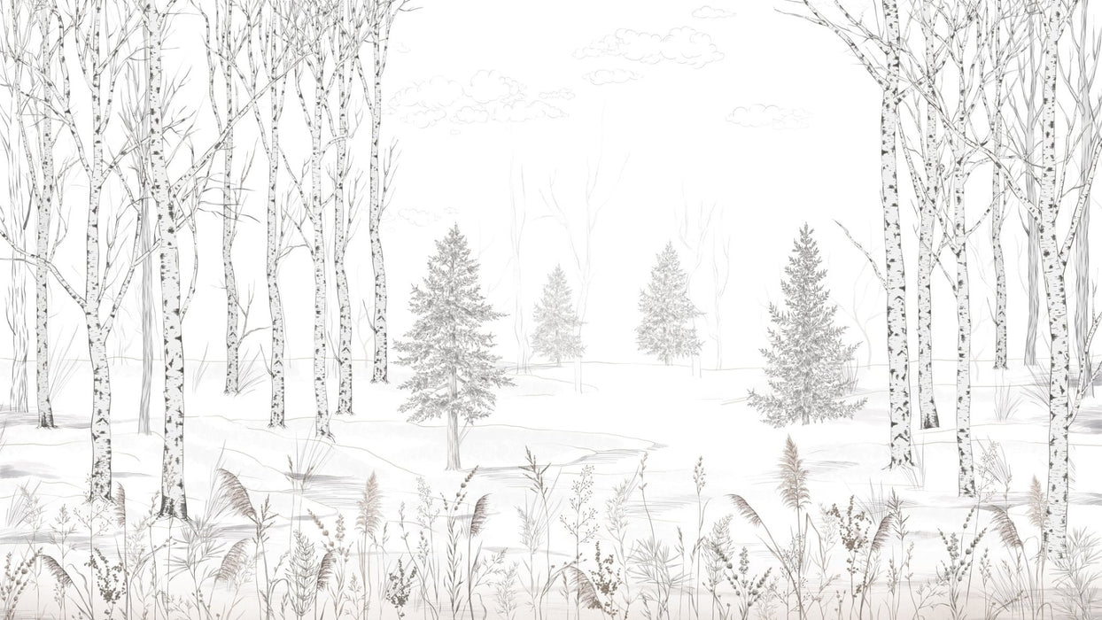 Transform your interior with Douceur des Bois, a black and white panoramic forest wallpaper with an elegant and timeless aesthetic. This XXL wall mural depicts a forest of birch and fir trees, captured in a subtle and refined winter atmosphere. Its unique gray scale style, inspired by line drawing, brings depth, perspective, and poetry to your walls.