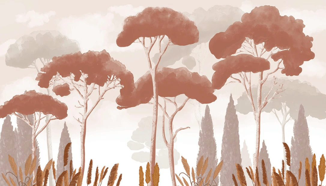 Cypress, pine, and pampas grass wallpaper in terracotta