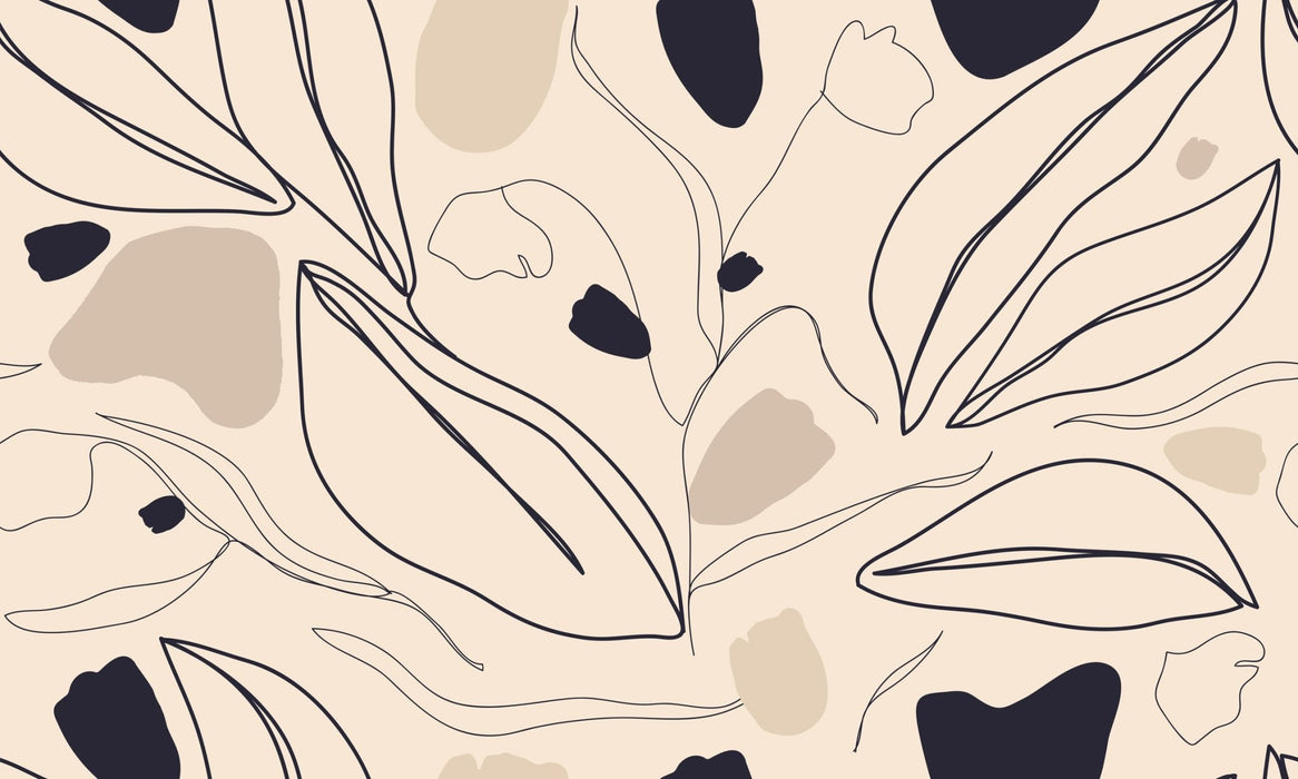 Its light pattern, drawn in fine black lines, evokes leaves and petals in an artistic and delicate style. The flat colors in nude, taupe, and pinkish beige tones create a soft and natural atmosphere, perfect for a soothing and modern interior.