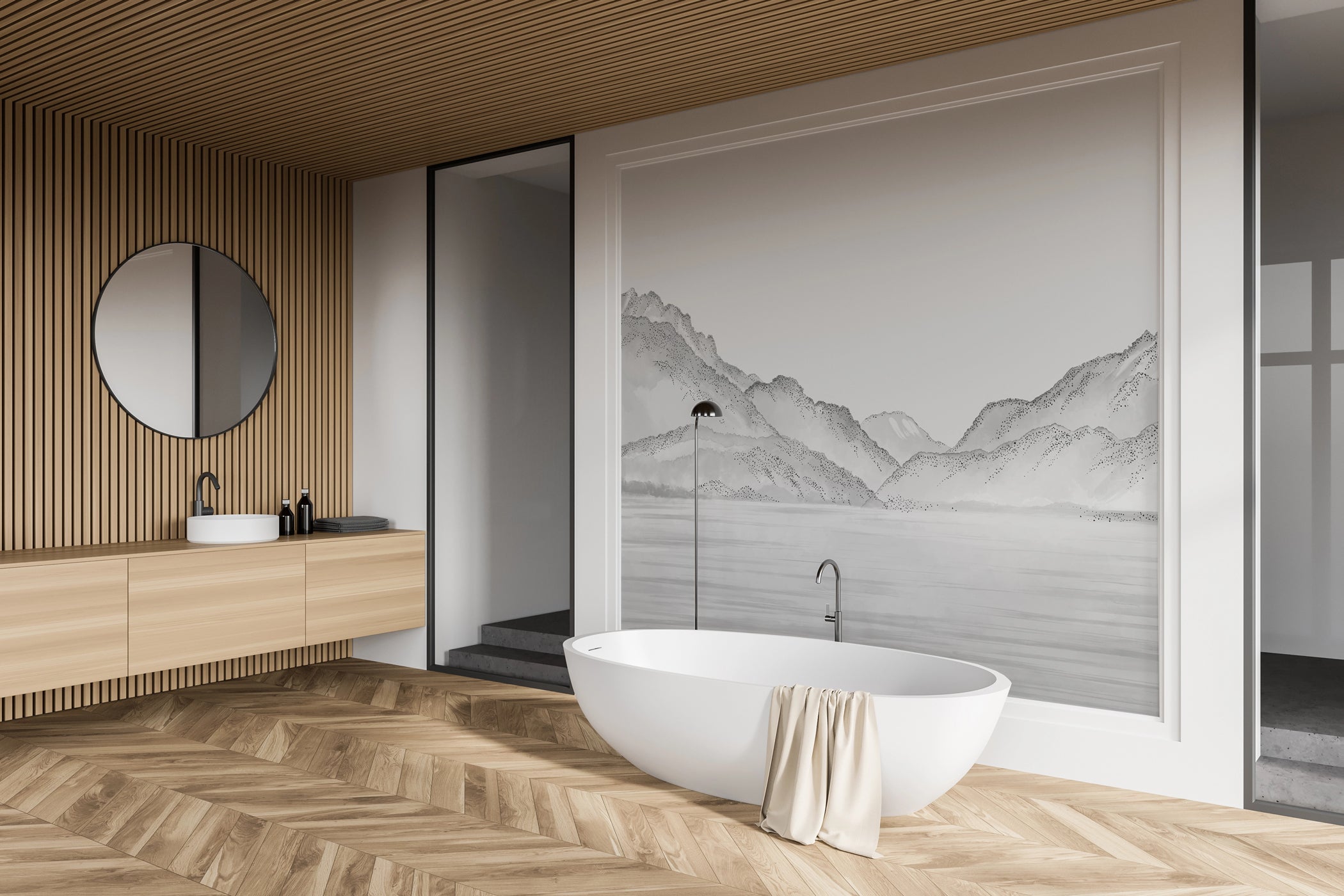 Élevez votre intérieur avec ce papier peint panoramique Lac d’Annecy, une fresque murale noir et blanc inspirée des paysages alpins. Son design pointillé crée un relief subtil qui transforme n’importe quel espace en intérieur de rêve.