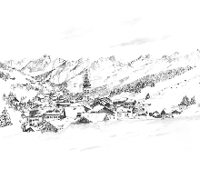 Papier peint panoramique La Clusaz en peinture - Noir et blanc