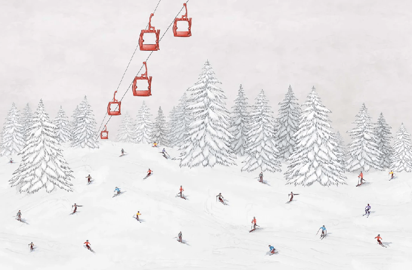 Papier peint télécabine skieurs colorés